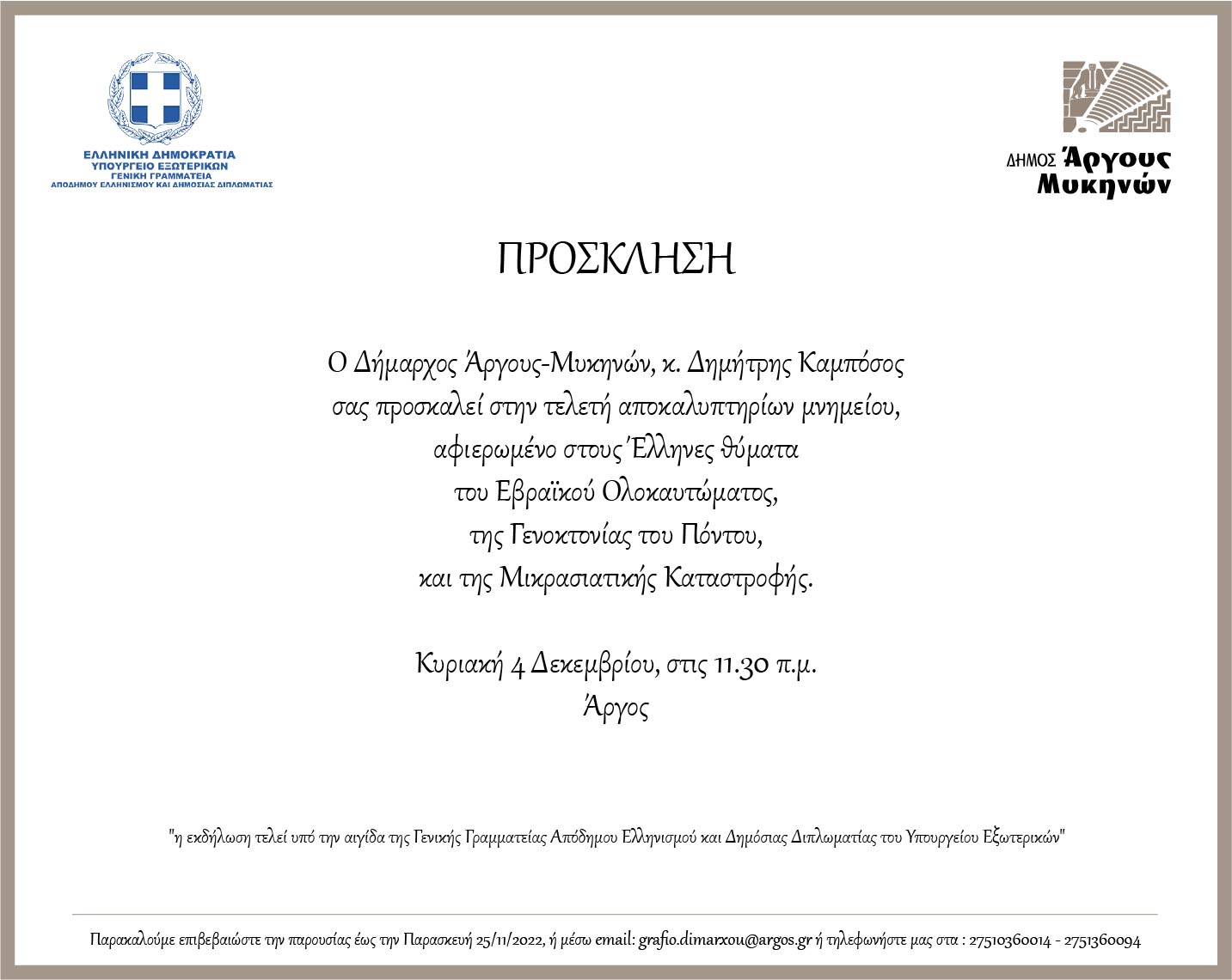 Η Δικηγορική Εταιρεία μας με μεγάλη χαρά και ιδιαίτερη τιμή παρευρέθηκε διά των κκ. Οικονομάκη Χρήστου (Ιδρυτικός Εταίρος) και Κοκκοράκη Μαρίας (Γενική Διευθύντρια) στην εκδήλωση-τελετή αποκαλυπτηρίων μνημείου, αφιερωμένο στους Έλληνες θύματα του Εβραϊκού ολοκαυτώματος, της γενοκτονίας του Πόντου και της Μικρασιατικής καταστροφής, που πραγματοποιήθηκε την Κυριακή 4 Δεκεμβρίου 2022 στην Αίθουσα Τέχνης και Πολιτισμού «Μέγας Αλέξανδρος» και εν συνεχεία στην Πλατεία Δημοκρατίας στο Άργος. Η εκδήλωση διοργανώθηκε από τον Δήμαρχο Άργους και Μυκηνών & Πρόεδρο της Περιφερειακής Ένωσης Δήμων Πελοποννήσου και υπό την αιγίδα του Υπουργείου Εξωτερικών και της Γενικής Γραμματείας Απόδημου Ελληνισμού και Δημόσιας Διπλωματίας.
