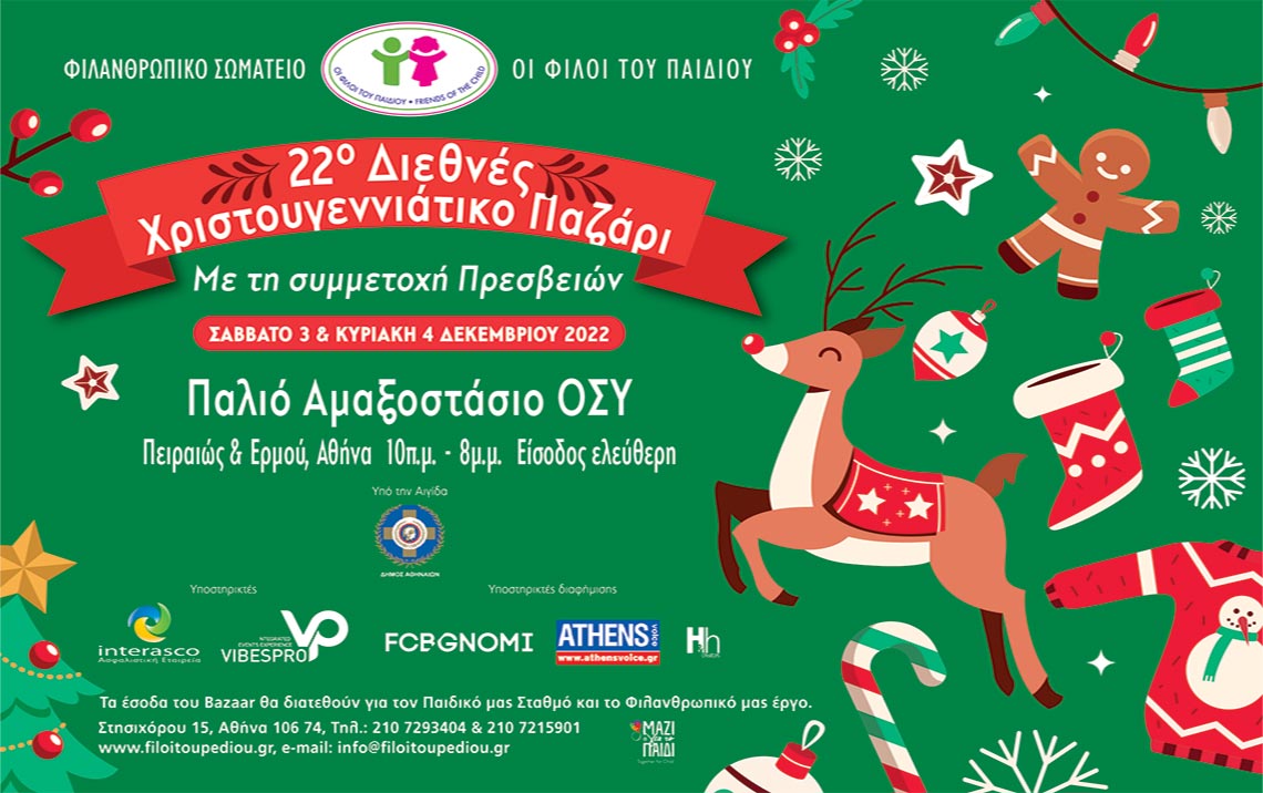 Το Διεθνές Χριστουγεννιάτικο Bazaar πραγματοποιείται με την συμμετοχή Πρεσβειών, οι οποίες δίνουν την επιλογή στο κοινό να γνωρίσουν τοπικές γεύσεις, μουσικές, ήθη και έθιμα της εκάστοτε χώρας, διαμορφώνοντας ένα πλαίσιο στήριξης του Σωματείου και του έργου του.