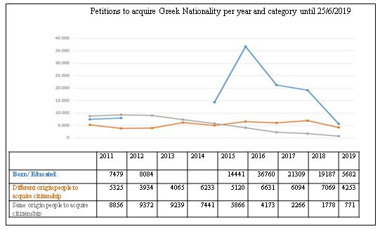 A diagram follows on the pleas of acquiring Greek Nationality status per year and category going back form year 2011 and until 25-6-2019, from which it derives the number of different origin foreigners that since 2011 and until June 2019 had submitted a n application in order to acquire Greek Nationality through Citizenship (for instance, for the year 2018 there were 7.069 applicants).